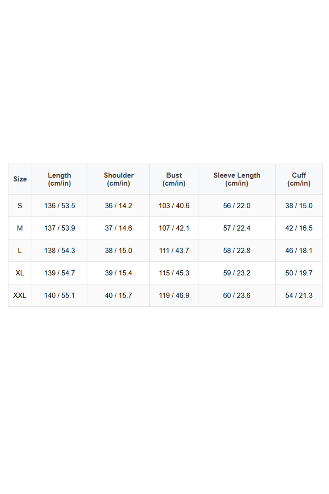 | Size | Length (cm / in) | Shoulder (cm / in) | Bust (cm / in) | Sleeve Length (Excl. Feather) (cm / in) | Cuff (cm / in) |